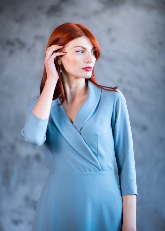 Rochie din jeans elastic. Meg are înălțimea 1,75m și poartă o rochie mărimea S, cu lungime de 120 cm Lungimea rochiei poate fi alta, o stabilim