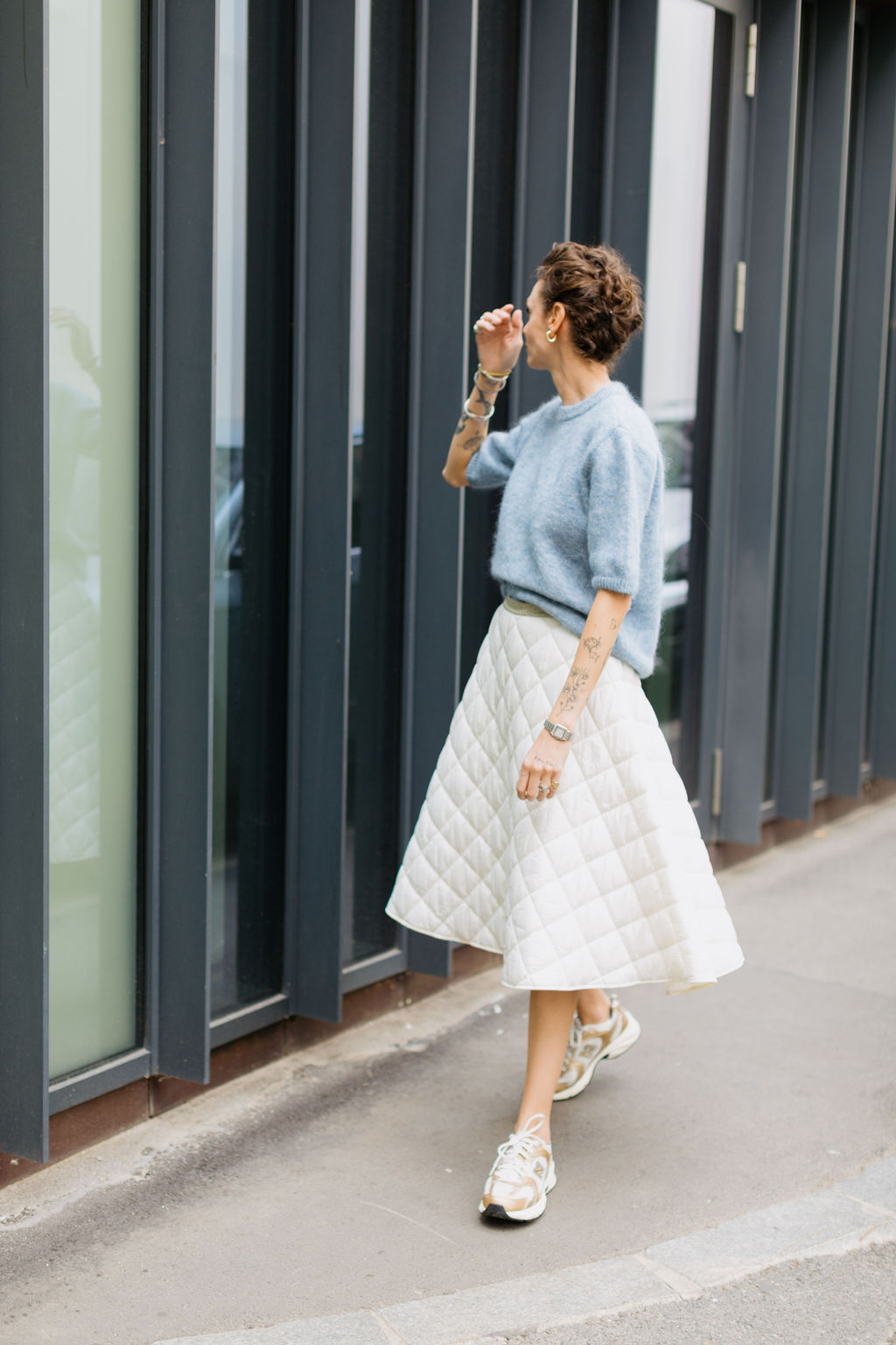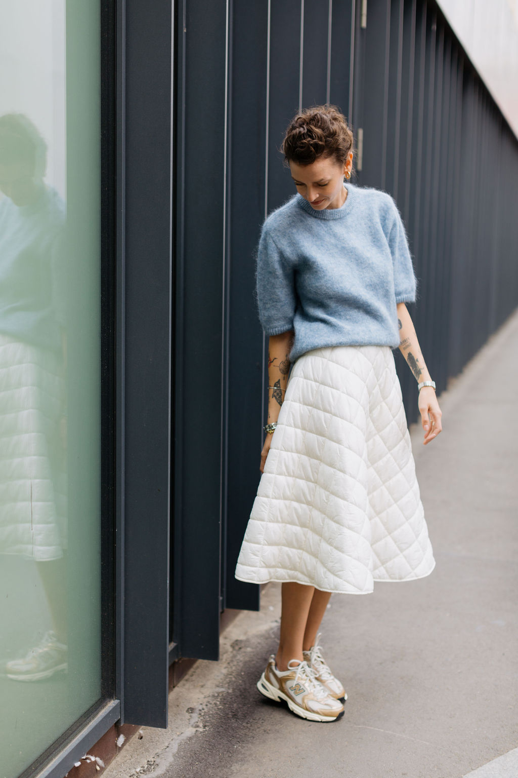 Fustă ampla din fas matlasat cu betelie din elastic.