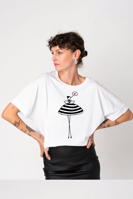 Tricou din bumbac organic. Desen realizat da Ama la varsta de 11 ani. Model relaxed – croiala lejera Marimea XS: Bust 90 cm, Lungime tricou 56,5